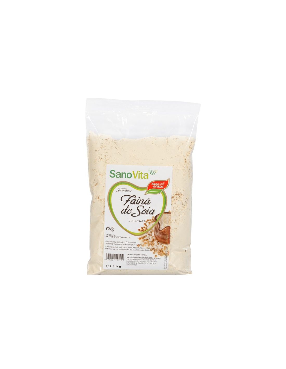 Făină din soia degresată, măcinată la o granulaţie similară făinii de grâu. Poate fi folosită în proporție de până la 30% în aluatul de pizza sau de pâine, în paste făinoase, prăjituri, sosuri etc. Aluatul astfel obținut este mult mai bogat în proteine, vitamine (complexul B), minerale şi acizi graşi, având un grad mult mai scăzut de perisabilitate.