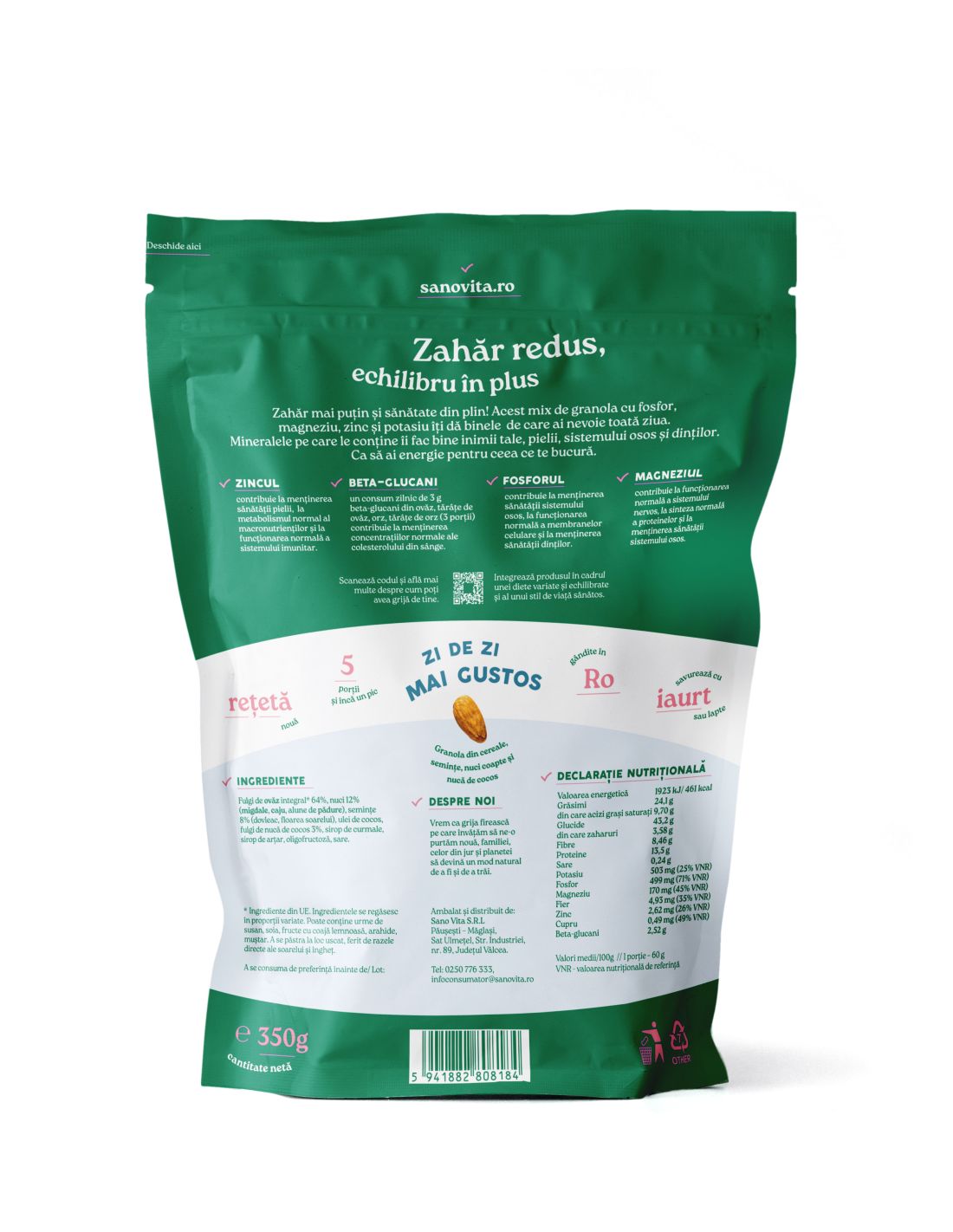 Zahăr redus, echilibru în plus. Zahăr mai puțin și sănătate din plin! Acest mix de granola cu fosfor, magneziu, zinc și potasiu îți dă binele de care ai nevoie toată ziua. Mineralele pe care le conține îți fac bine inimii tale, pielii, sistemului osos și dinților. Ca să ai energie pentru ceea ce te bucură.