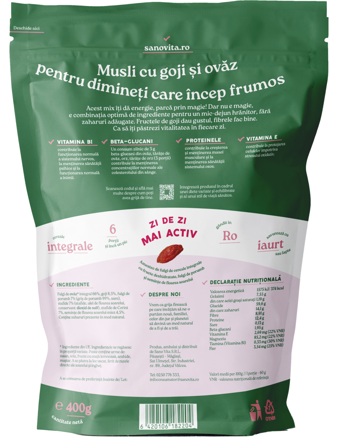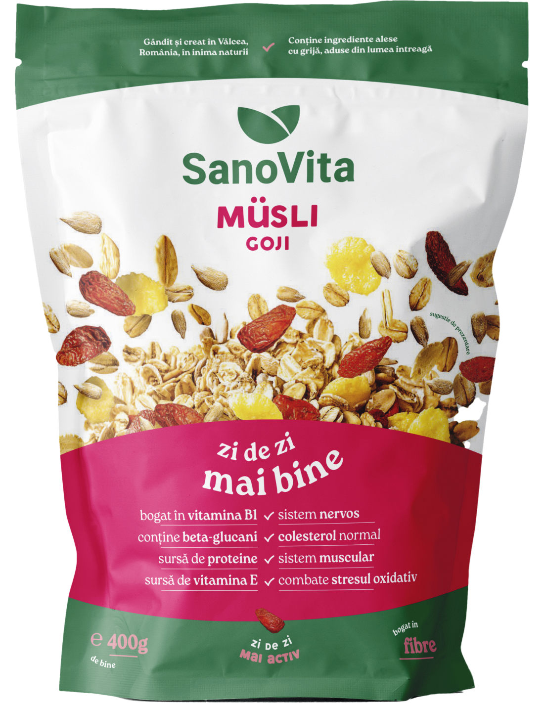 Musli cu goji și ovăz pentru dimineți care încep frumos. Acest mix îți dă energie, parcă prin magie! Dar nu e magie, e combinația optimă de ingrediente pentru un mic-dejun hrănitor, fără zaharuri adăugate. Fructele de goji dau gustul, fibrele fac bine. Ca să îți păstrezi vitalitatea în fiecare zi.