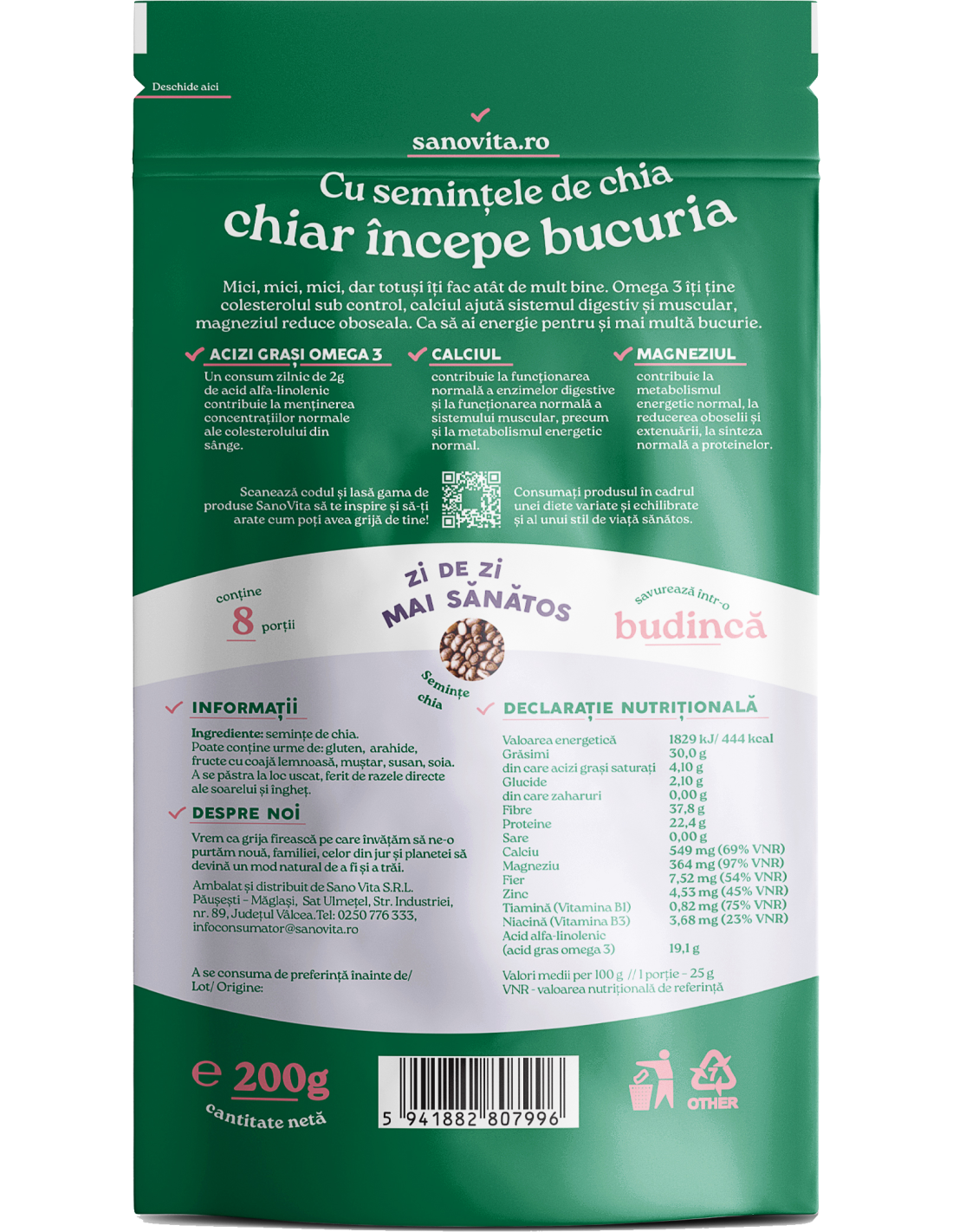 Cu semințele de chia chiar începe bucuria. Mici, mici, mici, dar totuși îți fac atât de mult bine. Omega-3 îți ține colesterolul sub control, calciul ajută sistemul digestiv și muscular, magneziul reduce oboseala. Ca să ai energie pentru și mai multă bucurie.