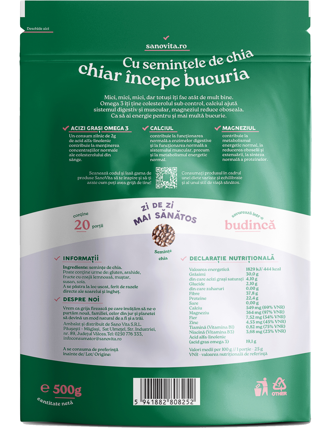 Semințe de chia. Poate conține urme de: gluten, arahide, fructe cu coajă lemnoasă, muștar, susan, soia.